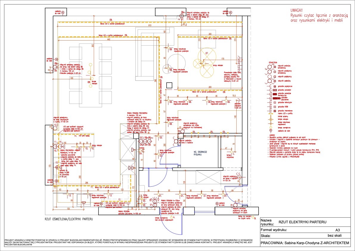 – projekt elektryki na rzutach (usytuowanie punktów świetlnych na ścianach i sufitach, oraz rozplanowania gniazdek elektrycznych)w skali 1:50;